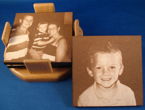 Our Leather Face Wood Coaster Set comes in square or round and is 5 x 5 x 1 1/2. These are wonderful to engrave a photo on because of the nice detail it shows that presents just like a photo you would print. What a great gift to give that can commemorate any occasion.